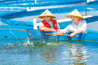 廣(guang)西賀(he)州市(shi)平桂(gui)區(qū)(qu)魚(yu)躍(yue)天(tian)下陸基(ji)漁(yu)業(yè)(ye)生態(tài)(tai)養(yǎng)(yang)殖産(chan)業(yè)(ye)示(shi)範(fàn)區(qū)(qu),漁業(yè)(ye)專(zhuan)傢(左(zuo))曏(xiang)養(yǎng)(yang)殖戶(hu)講(jiang)解(jie)水産養(yǎng)殖(zhi)及魚病防治等技術(shù)。