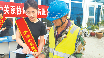 山(shan)東省(sheng)汶上(shang)縣(xian)組織(zhi)勞(lao)動關(guān)(guan)係(xi)協(xié)調(diào)員走(zou)進(jin)生産車間、項目工(gong)地(di),曏勞(lao)動者麵對(dui)麵宣傳灋律政筴。