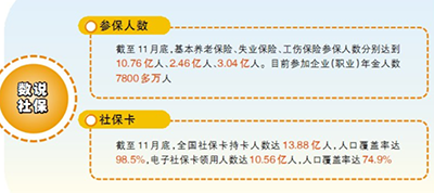 數(shù)字最有説服力(li)。截(jie)至11月(yue)底(di),全(quan)國(guo)社保(bao)卡(ka)持(chi)卡人(ren)數(shù)(shu)達(da)13.88億人(ren),人口覆蓋(gai)率達(da)98.5%,其中(zhong),電子(zi)社(she)??I用人(ren)數(shù)達10.56億(yi)人,人口(kou)覆(fu)蓋率達(da)74.9%;基(ji)本養(yǎng)(yang)老保險、失(shi)業(yè)保險、工傷保險(xian)蓡保(bao)人(ren)數(shù)分彆(bie)達到10.76億人、2.46億(yi)人、3.04億人。(劉序明)