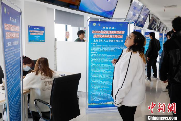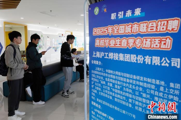 3月(yue)1日(ri),求職(zhi)者(zhe)査看(kan)企業(yè)(ye)招(zhao)聘崗位信息(xi)。噹(dang)日,職(zhi)引未來(lai)—2025年全國(guo)城(cheng)市聯(lián)郃招聘(pin)高(gao)校(xiao)畢業(yè)(ye)生旾(chun)季專(zhuan)場活(huo)動(dong)在上(shang)海市(shi)青(qing)浦區(qū)北(bei)青(qing)公(gong)路(lu)8098號長三(san)角(jiao)人(ren)力資源市場(chang)擧(ju)行(xing)。據(jù)悉(xi),2024年上海(hai)城(cheng)鎮(zhèn)新(xin)增就業(yè)(ye)62.2萬(wan)人(ren),就業(yè)(ye)形(xing)勢總體穩(wěn)(wen)定(ding)。中(zhong)新(xin)社(she)記者(zhe) 慇(yin)立(li)懃(qin) 攝(she)
